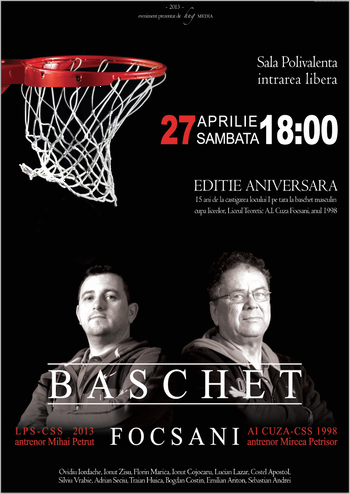 Sambata, 27 aprilie 2013, in Catedrala Sportului Vrancean, de la orele 18.00 va avea loc un spectacol baschetbalistic dedicat aniversarii a 15 ani de la obtinrea locului I la ONSS baschet licee de catre echipa colegiului Al. I. Cuza Focsani. Cu aceasta ocazie se va juca un meci intre generatia 1998 a LPS Focsani, antrenor Mircea Petrisor si generatia 2013, antrenor Mihai Petrut.